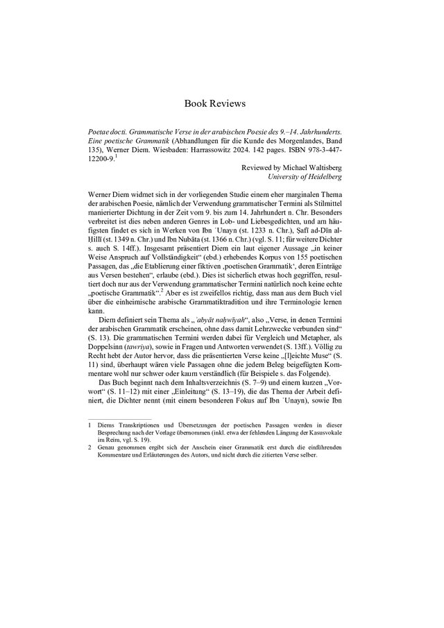 Poetae docti. Grammatische Verse in der arabischen Poesie des 9.‒14. Jahrhunderts. Eine poetische Grammatik (Abhandlungen für die Kunde des Morgenlandes, Band 135), Werner Diem. Wiesbaden: Harrassowitz 2024. 142 pages. ISBN 978-3-447-12200-9.